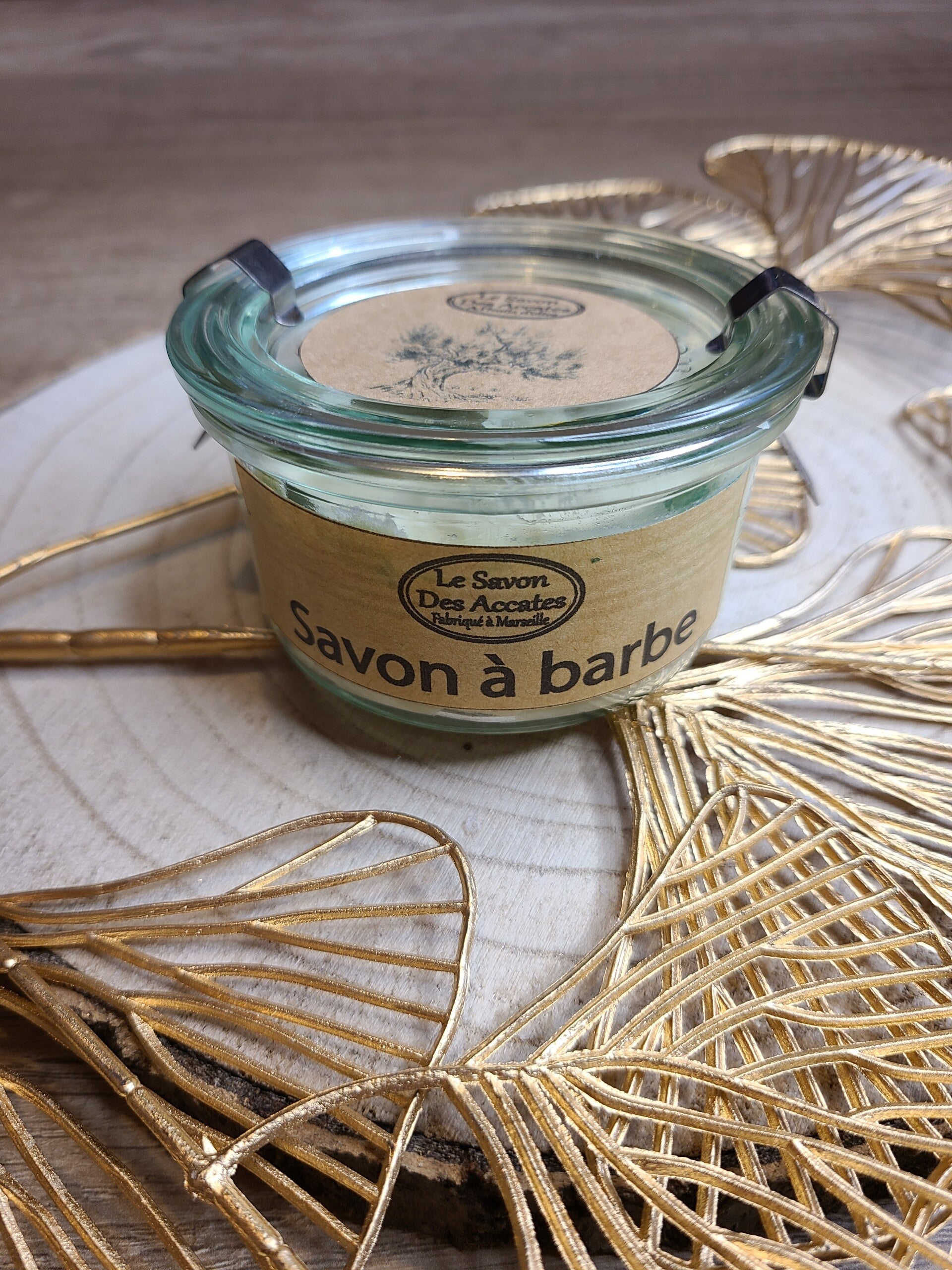 Notre savon à barbe est présenté dans un pot en verre avec couvercle.
